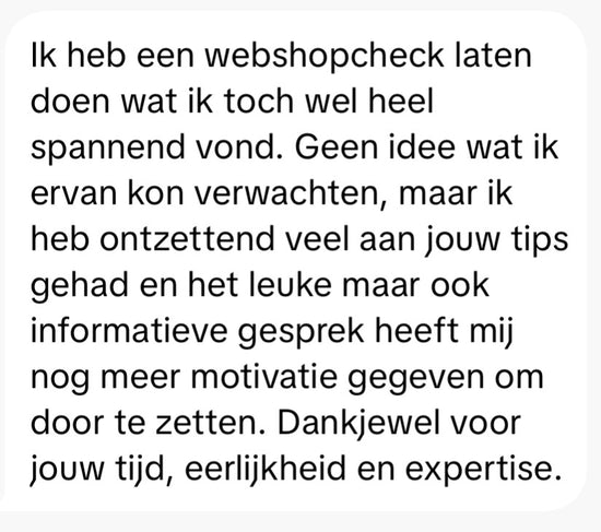 Uiteraard ontvang je nog een samenvatting van mijn bevindingen en kun jij dezelfde dag nog met je webshop aan de slag.